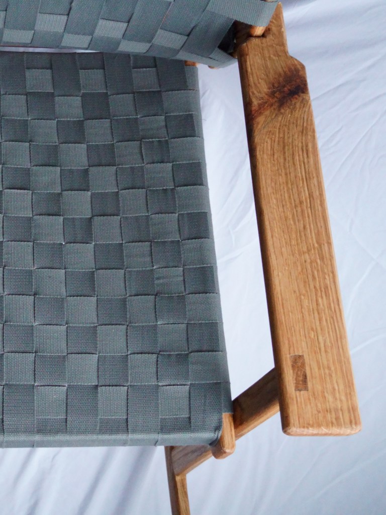 “Nephew Rocker” in rustic white oak with olive drab webbed seat. 2026